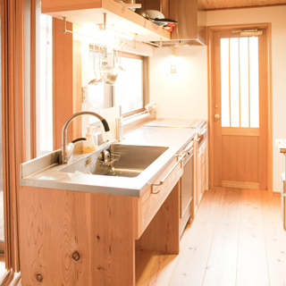 杉で作られたキッチン(天板はステンレス)、水屋は料理、食器、調理器具を美しく演出してくれます。生ゴミによる匂いは杉や珪藻土が吸収してくれます。オーダーメイドで一人一人その人に丁度合ったサイズ、仕様で作ることが可能です。